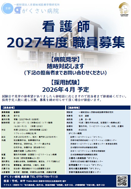応募方法 | 当該ホームページの下部に設置している「応募フォーム」から応募してください。 応募書類送付先及び連絡先:〒604-8845 京都市中京区壬生東高田町1番9 がくさい病院 総務課 075-754-7110(総務課) 担当者名:法人事務局 竹村 メールアドレス:takemura@gakusai.or.jp |